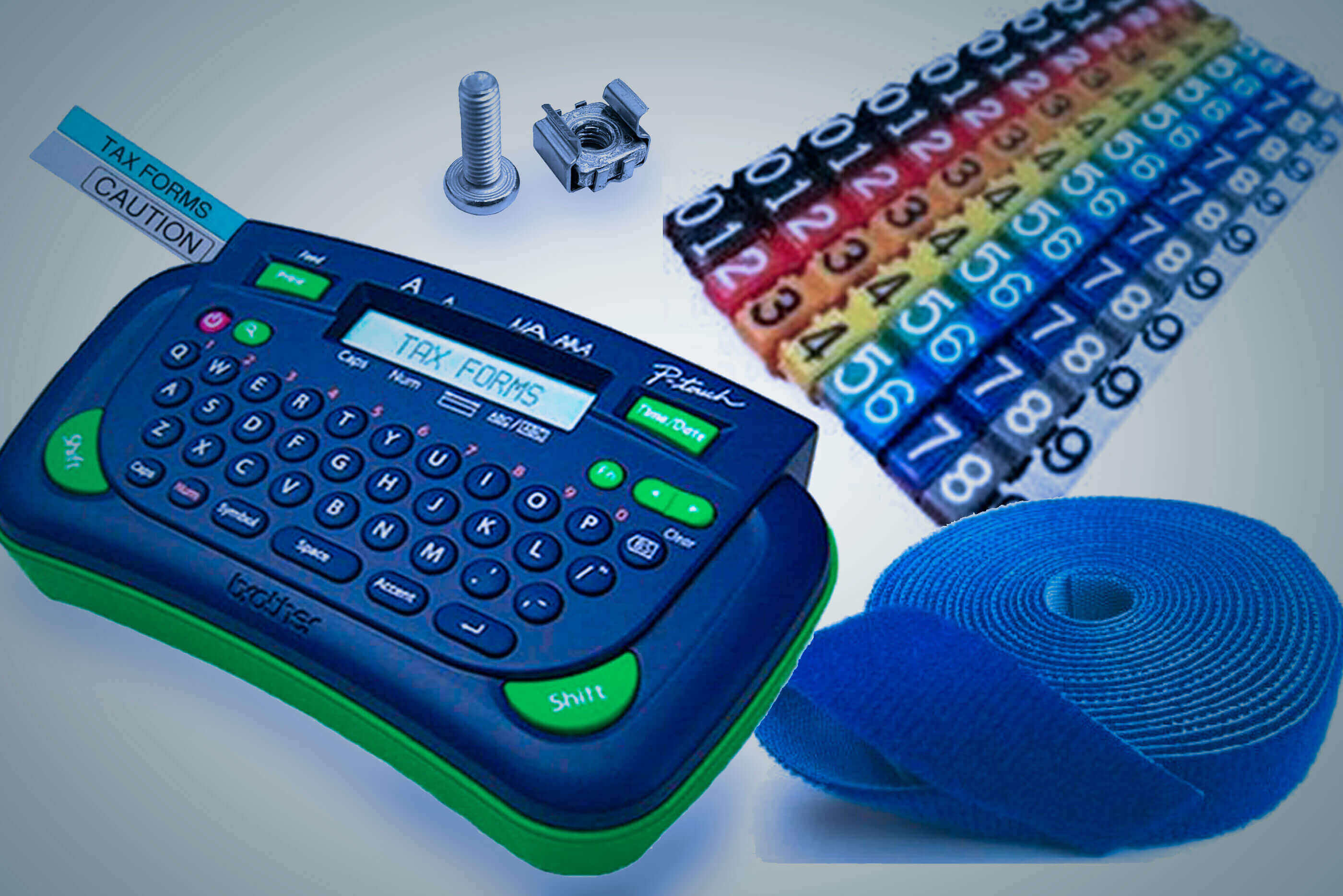 Rotuladores • Etiquetas • Velcros • Abraçadeiras • Anilha de identificação • Kit porta gaiola e parafusos para racks e outros